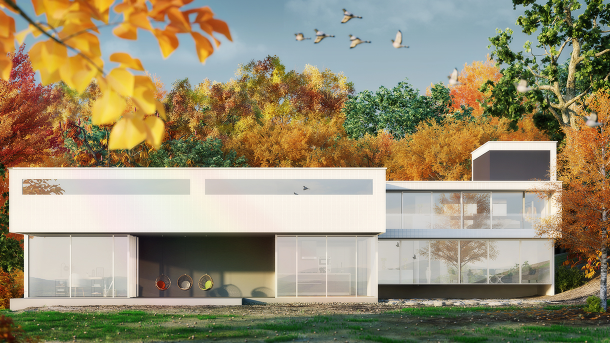 Una casa moderna che si fonde con la tavolozza infuocata dell'autunno, creando un contrasto suggestivo tra linee pulite e colori vibranti. Un rifugio di design immerso nella bellezza della natura, dove il cambiamento di stagione diventa uno spettacolo quotidiano.