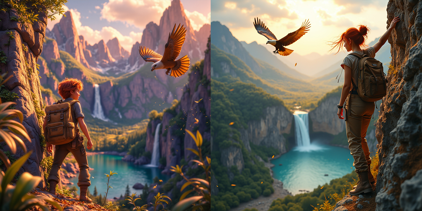 Un affascinante confronto tra mondo illustrato e fotografia che ritrae la stessa scena avventurosa: un'esploratrice dai capelli rossi contempla un maestoso paesaggio montano con cascate e un'aquila in volo. La magia della fantasia si fonde con la bellezza tangibile della natura, creando un ponte visivo tra l'immaginazione artistica e la realtà mozzafiato dei paesaggi selvaggi.