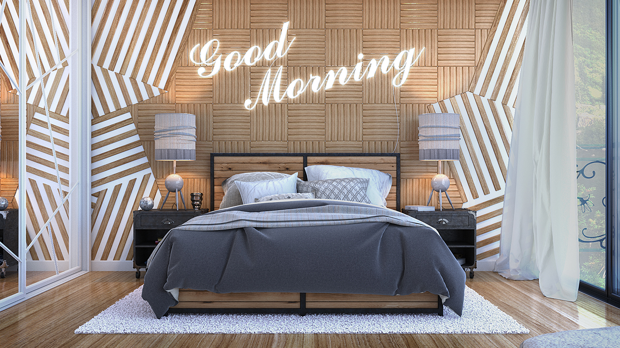 Un mix di texture e motivi geometrici per una camera da letto che non passa inosservata. Il legno naturale crea un'atmosfera calda e avvolgente, perfetta per iniziare la giornata con il sorriso.