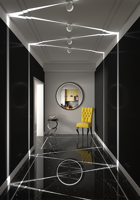 Un corridoio drammatico dove una sedia gialla audace spezza la monocromia degli interni scuri. Il pavimento riflettente e lo specchio rotondo amplificano la luce, creando un'entrata elegante e teatrale.