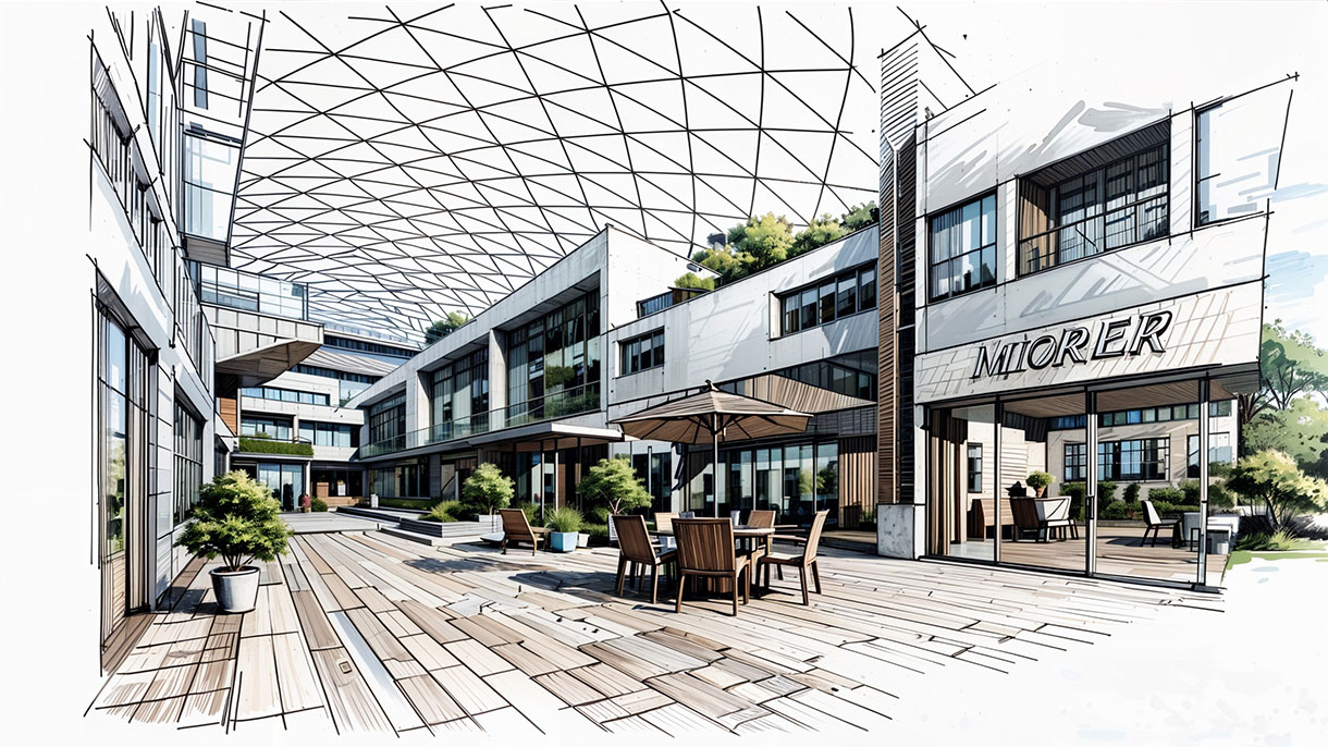 Un progetto che reinterpreta la tradizione dei cortili con linee moderne e spazi conviviali. L’ampia copertura trasparente e le finiture in legno valorizzano l’ambiente, creando un’atmosfera accogliente e dinamica.