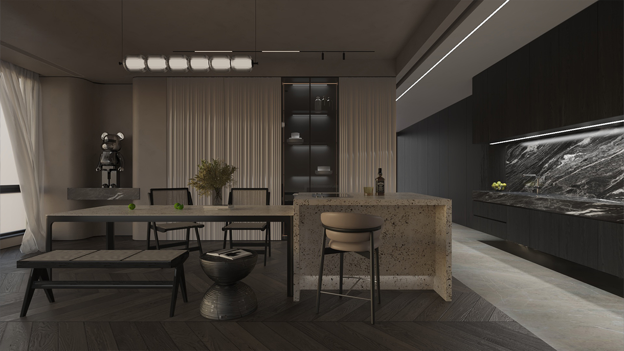 Il bancone si staglia contro la drammatica parete in marmo nero venato, creando un'atmosfera di sofisticata modernità. L'illuminazione lineare e strategica esalta le texture dei materiali, mentre la palette monocromatica conferisce all'ambiente un'eleganza senza tempo, perfetta per un'esperienza culinaria di alto livello.