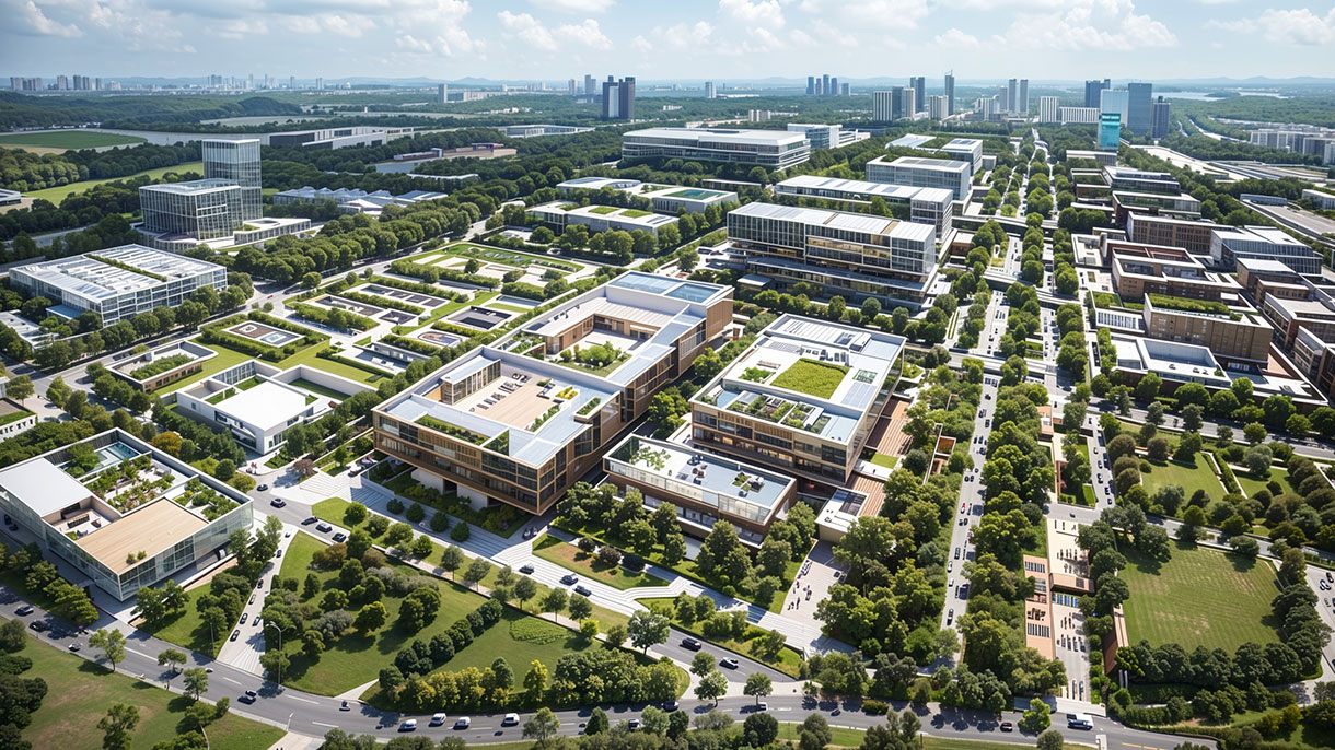 Visione aerea di un complesso universitario innovativo dove architettura moderna e natura coesistono in perfetta armonia. Edifici con tetti verdi, viali alberati e spazi aperti creano un ambiente sostenibile che rispetta l'ecosistema circostante.