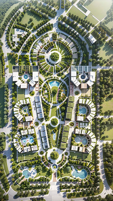 Un masterplan visto dall'alto rivela un design concentrico affascinante. Edifici, spazi verdi e specchi d'acqua si intrecciano in forme circolari creando un inedito paesaggio urbano dove natura e architettura si fondono in un disegno armonioso.