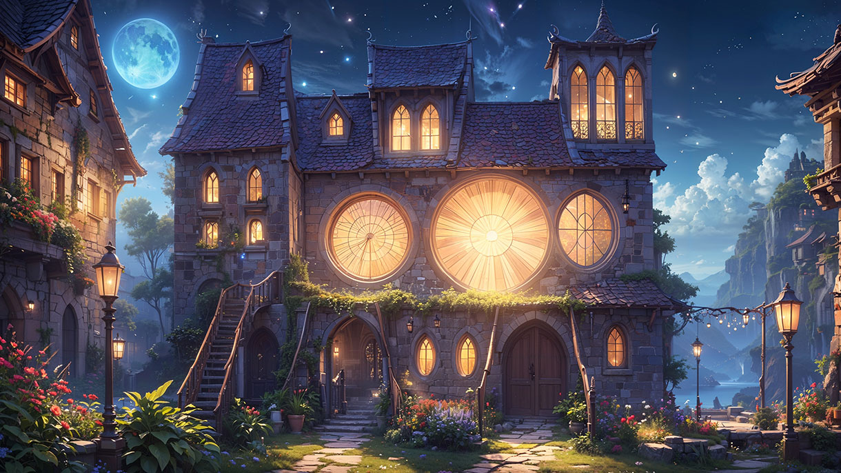 Un'architettura medievale si anima di luce e mistero, con finestre circolari che brillano come soli dorati contro il blu profondo della notte. La casa, avvolta da vegetazione e lanterne, sembra custodire antichi segreti, invitando lo spettatore a immergersi in un racconto di immaginazione e incanto.