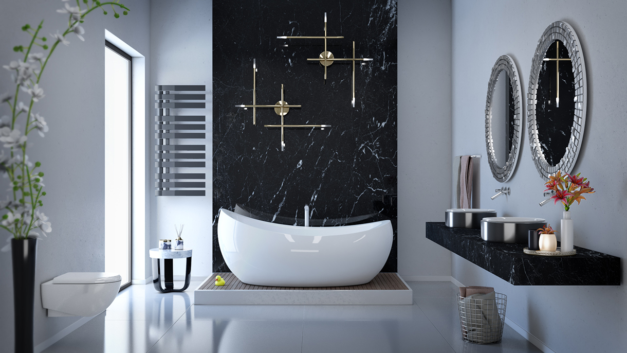 Un bagno di design dove il marmo nero drammatico si contrappone alla vasca bianca scultorea, creando un'atmosfera di eleganza contemporanea. La luce naturale e il verde delle piante ammorbidiscono l'ambiente, mentre il termoarredo geometrico aggiunge un elemento di funzionalità dal design ricercato.