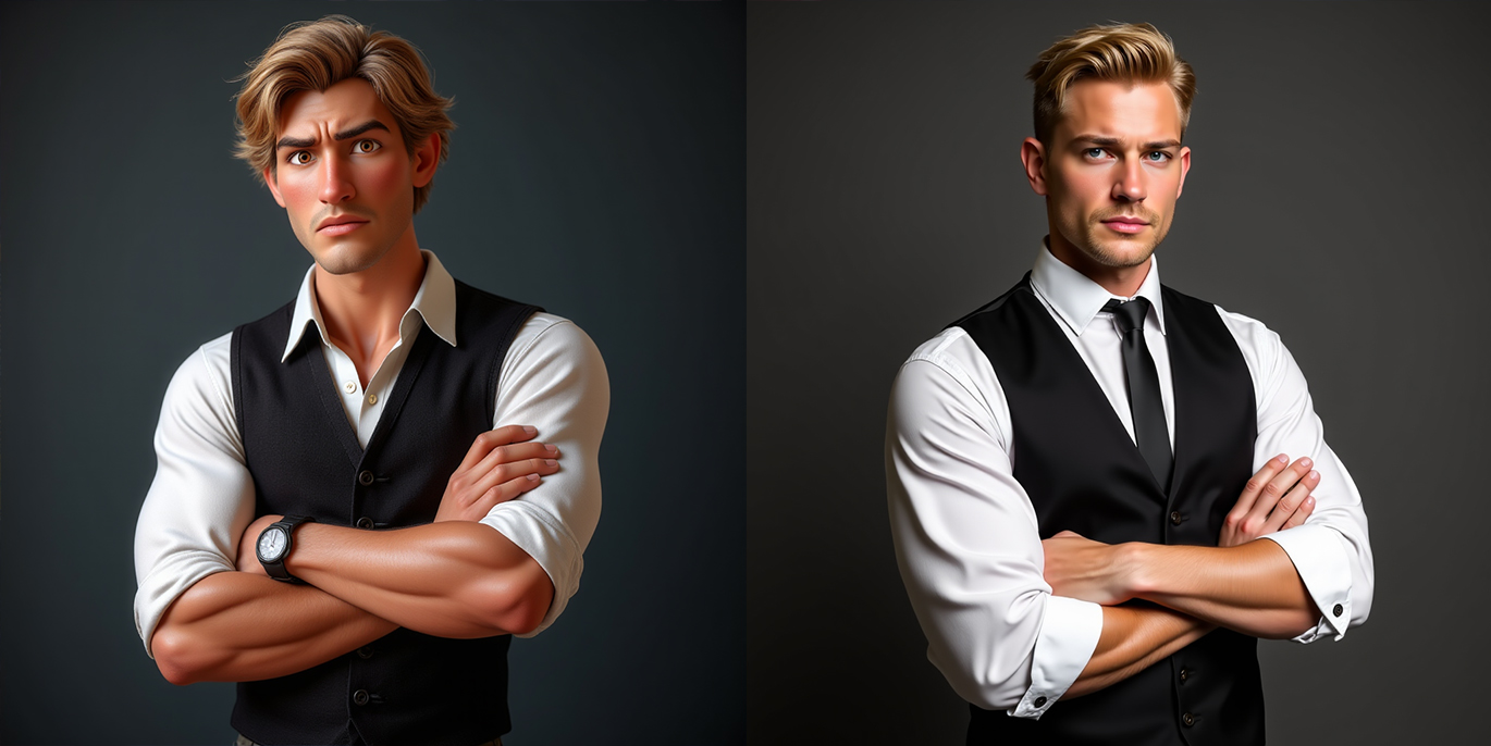 Un affascinante confronto tra l'illustrazione in stile Disney di un personaggio maschile e il suo equivalente nella realtà, entrambi ritratti con lo stesso outfit elegante composto da gilet nero e camicia bianca. Il parallelismo è accentuato dalla posa identica con le braccia incrociate, che sottolinea come l'arte possa ispirare e riflettere la realtà, mantenendo in entrambe le versioni un'aura di sicurezza e raffinatezza