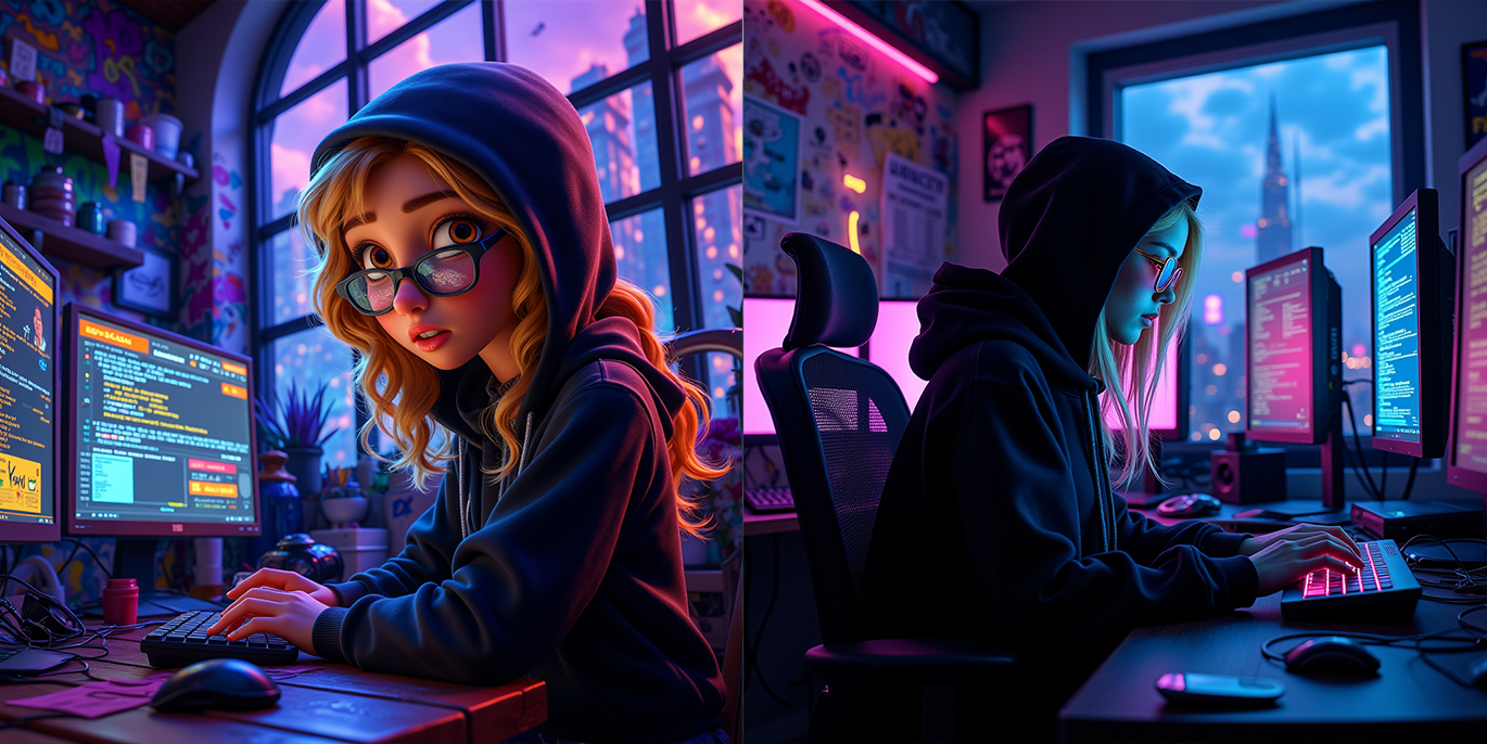 In una suggestiva composizione, si contrappone il mondo fantastico dell'anime con la realtà quotidiana. Nel silenzio della notte, due giovani programmatrici trasformano linee di codice in sogni digitali, immerse in un'atmosfera cyberpunk di luci viola e blu. La loro postazione di lavoro, decorata con sticker e poster, racconta la fusione perfetta tra cultura geek e professionalità tech, mentre la città fuori dalla finestra si tinge dei colori del crepuscolo digitale.