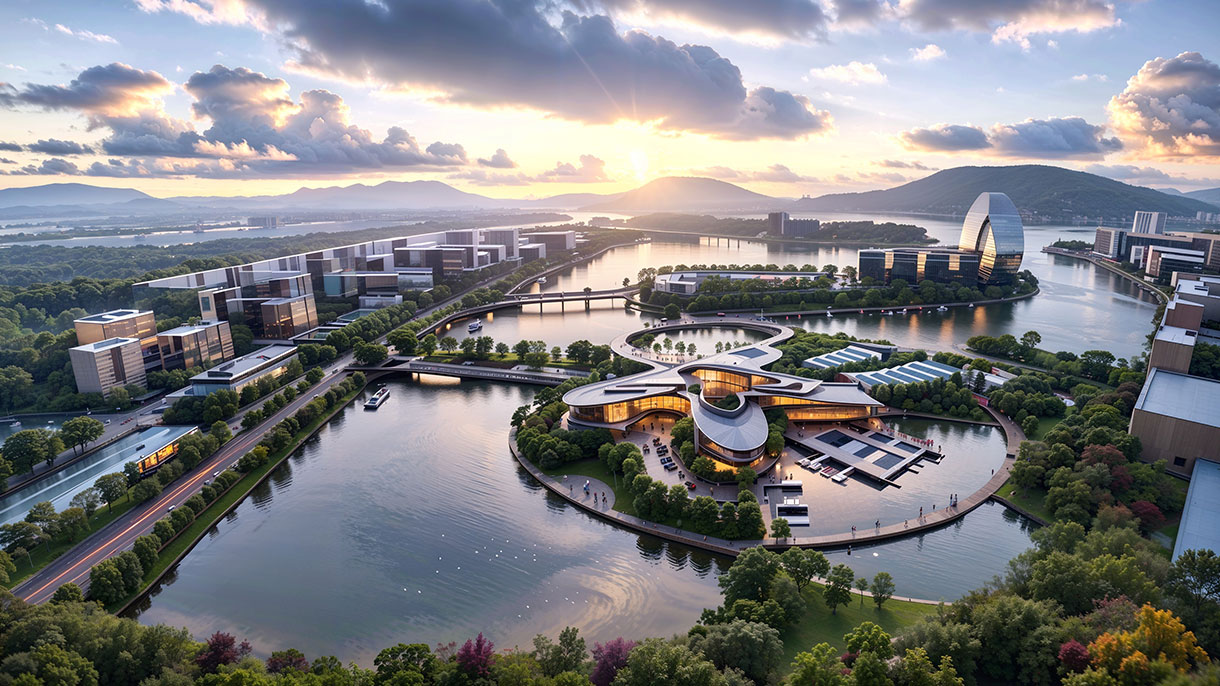 Un suggestivo complesso architettonico si specchia nelle acque al tramonto. L'edificio dalla forma organica al centro è circondato da ponti e viali, mentre sullo sfondo le montagne e il cielo creano una cornice naturale mozzafiato.
