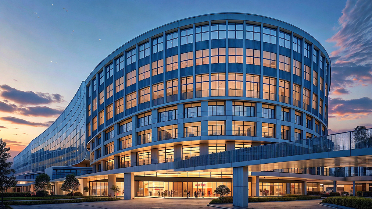 Le curve sinuose della facciata in vetro riflettono i colori caldi del tramonto, creando un effetto spettacolare che trasforma l'edificio in un'opera d'arte vivente. Le ampie vetrate creano una connessione visiva senza soluzione di continuità tra interno ed esterno, illuminando naturalmente gli ambienti di lavoro con la luce dorata del crepuscolo.