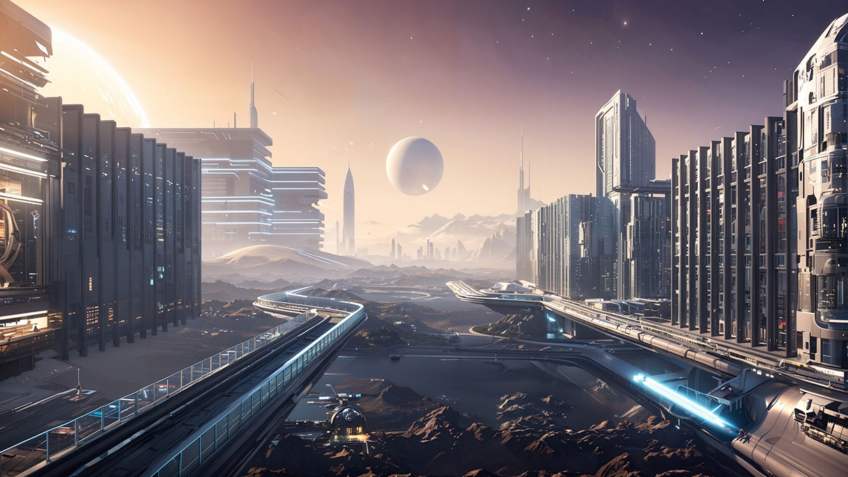 Questa visione di una metropoli futuristica cattura l'essenza di un mondo oltre i nostri confini attuali, con architetture ardite che si intersecano con paesaggi extraterrestri e una mobilità che sfida ogni immaginazione. L'immagine racconta una storia di progresso, dove l'innovazione umana si fonde con la vastità cosmica in un equilibrio di forma e funzione.