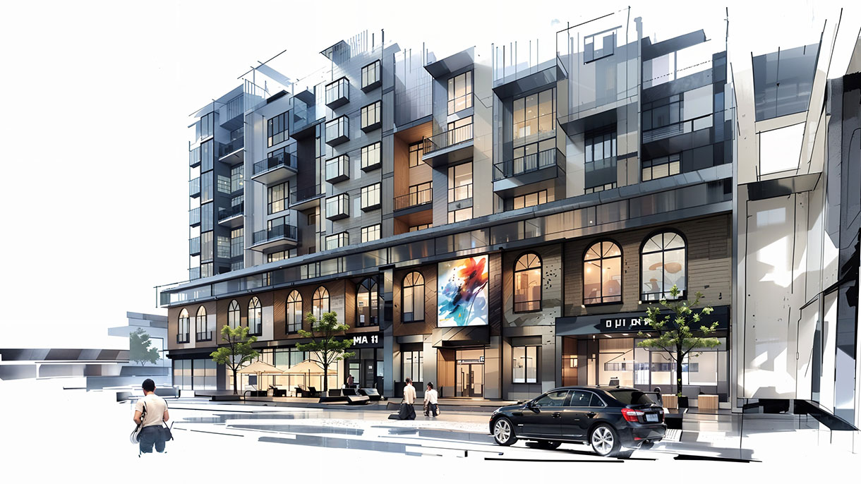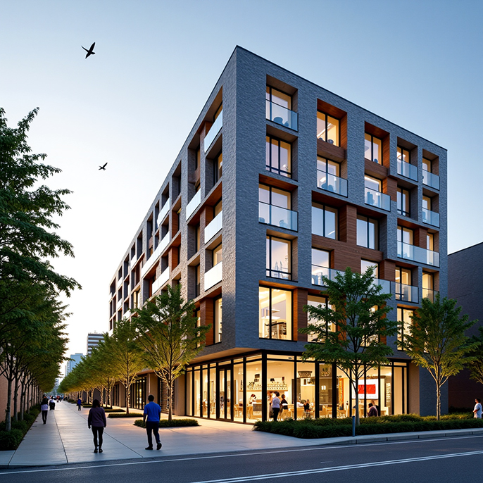 Un complesso residenziale moderno si erge come un'opera d'arte architettonica, dove volumi geometrici in grigio e legno si intrecciano con eleganti vetrate e spazi commerciali. L'immagine cattura l'essenza della vita contemporanea, dove design, funzionalità e arte si fondono in un equilibrio perfetto tra spazio privato e dinamiche urbane.