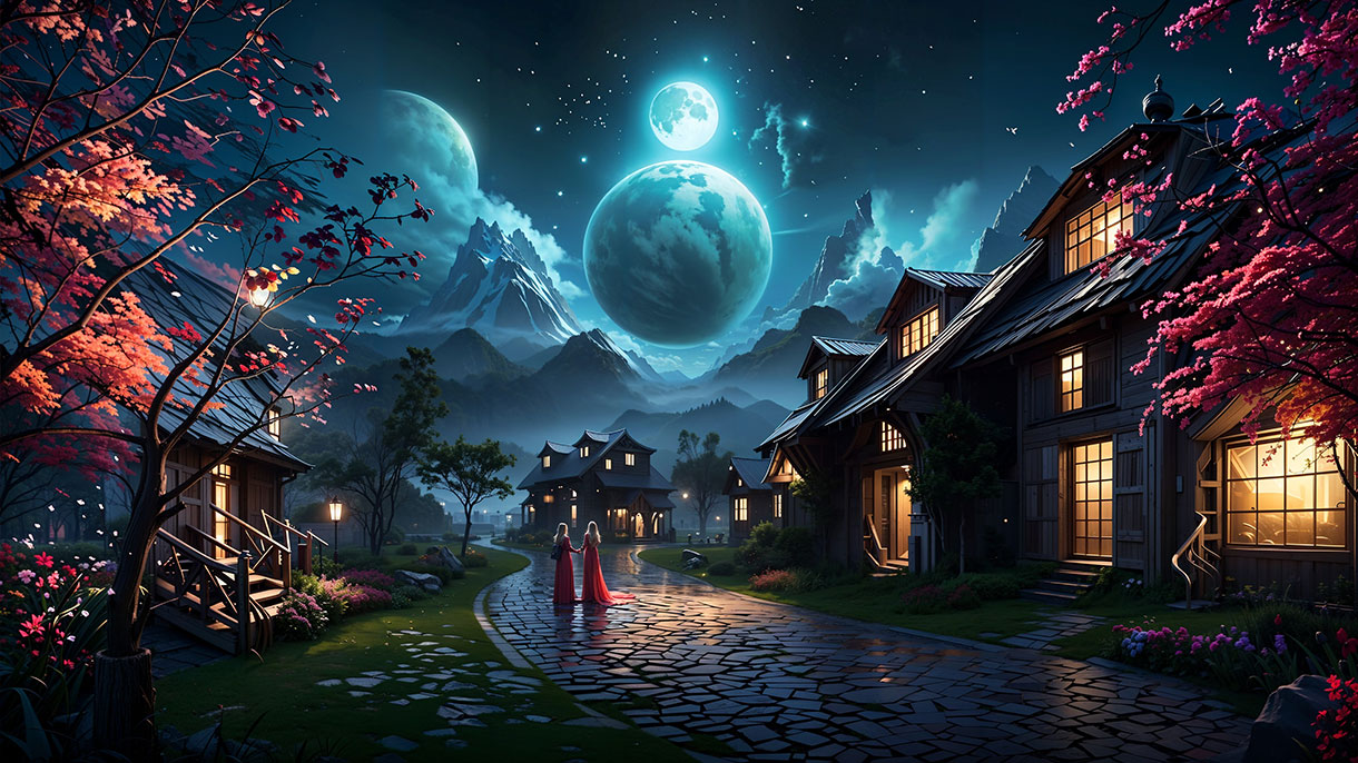 Un paesaggio incantato si svela tra case illuminate e un cielo sovraccarico di lune misteriose, dove due figure silenziose percorrono un sentiero di pietra. L'immagine racconta un momento di trasformazione, dove la normalità si fonde con la magia, e ogni dettaglio sembra nascondere un racconto segreto.