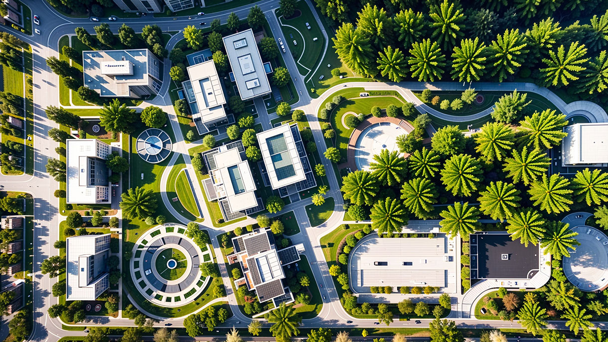 Una vista a volo d'uccello mostra un campus con palme disposte in pattern geometrici attorno a edifici moderni. La simmetria delle strutture bianche si contrappone alle forme organiche degli alberi, creando un ritmo visivo unico.