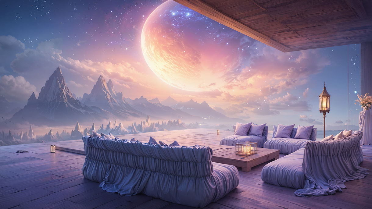 Questo scenario onirico fonde l'intimità di uno spazio domestico con l'immensità dell'universo, dove divani morbidi si affacciano su un paesaggio di montagne cristalline sotto un'eclissi lunare dai colori straordinari. L'immagine evoca una sensazione di pace e meraviglia, dove i confini tra interno ed esterno sembrano dissolversi in un'esperienza trascendente.