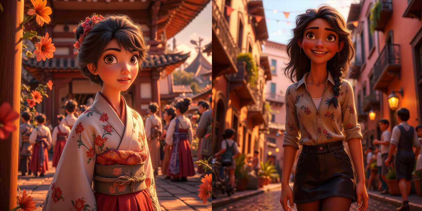 Questa illustrazione rappresenta la dualità culturale attraverso un personaggio che si muove tra un ambiente tradizionale asiatico e uno scenario urbano occidentale. Il contrasto tra i costumi e le ambientazioni evidenzia un affascinante dialogo tra diverse tradizioni e stili di vita.